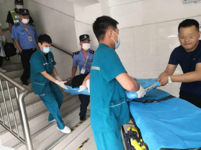 出诊医师了解病人伤情后,交代急救小组采用三人搬运法将患者放置担架上。在没有电梯的情况下,为了保证患者安全,急救小组人员累了一身汗,完全依靠人力慢慢将病人从楼梯抬下来,并成功送至医院救治。